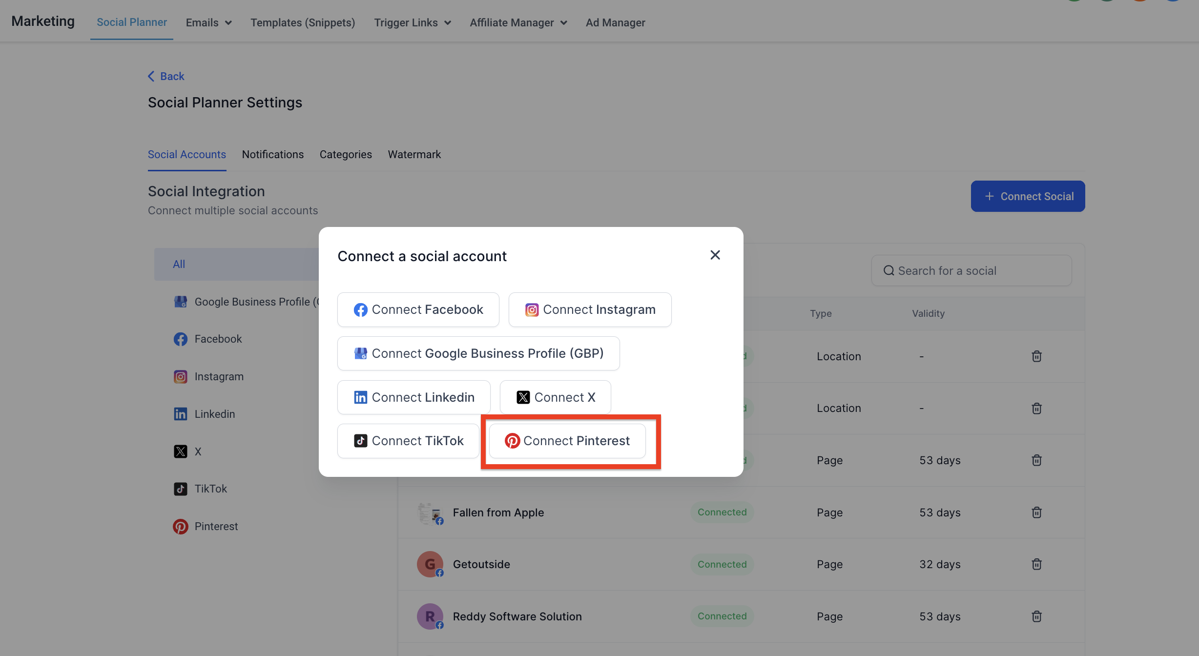 - Connect your Pinterest account (ensure you are an admin of the account).