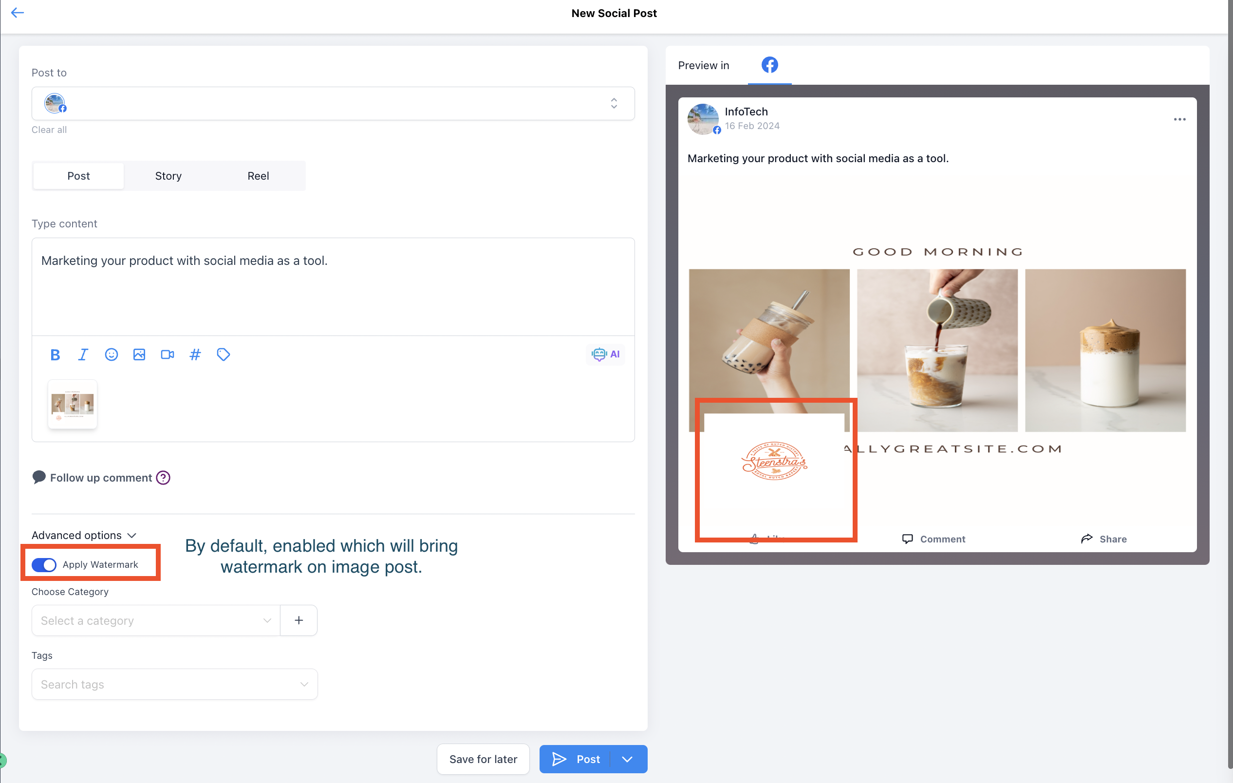 5. By default, watermark will be added to all the posts - image or videos. In the advance settings, we provide option ti turn off watermark.
