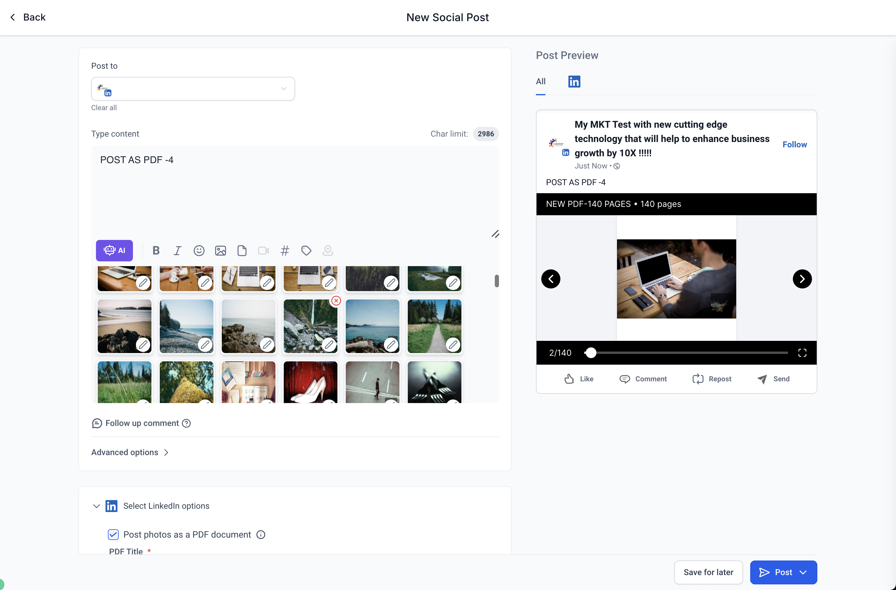 - When user selects post as a PDF option, all the images are converted into a PDF and posted to LinkedIn.