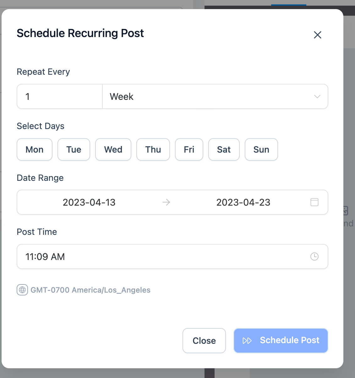 - Week - Users will have to choose day of the week when they would like to repeat schedule between the date range and post time.