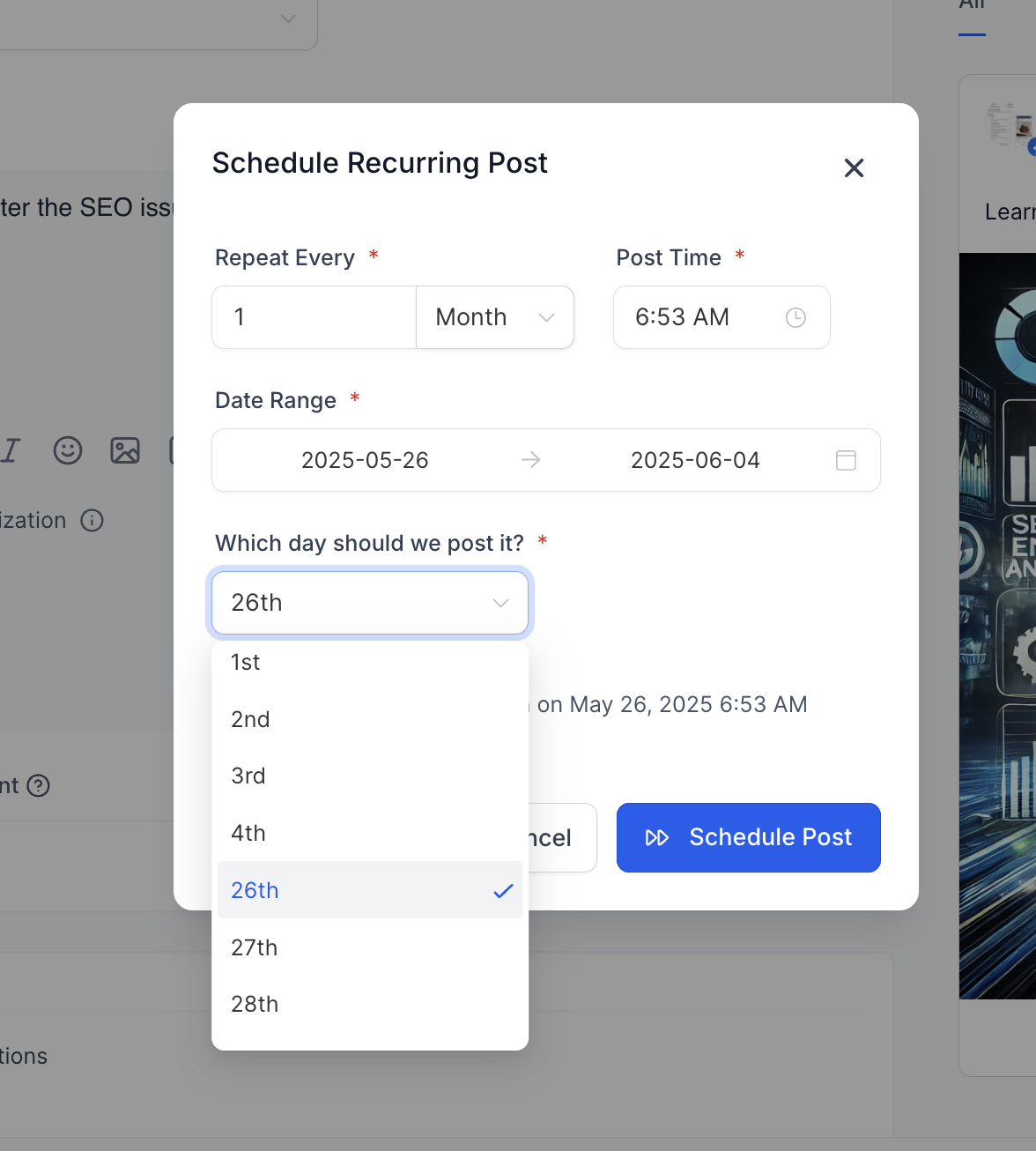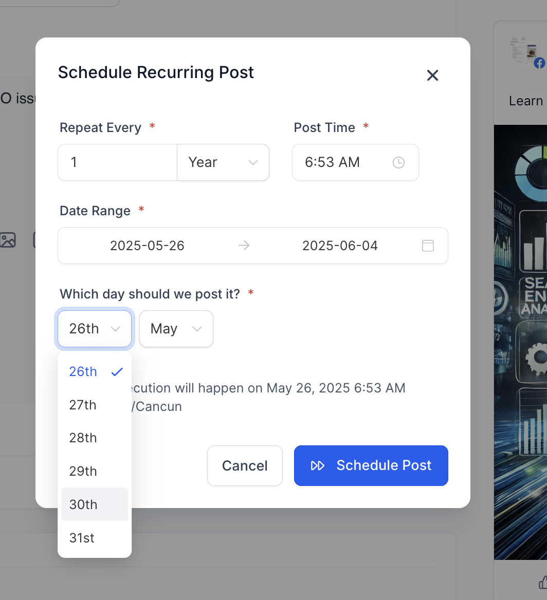 - Month - The user will have to choose the date and time of posting on repeat once in a month.