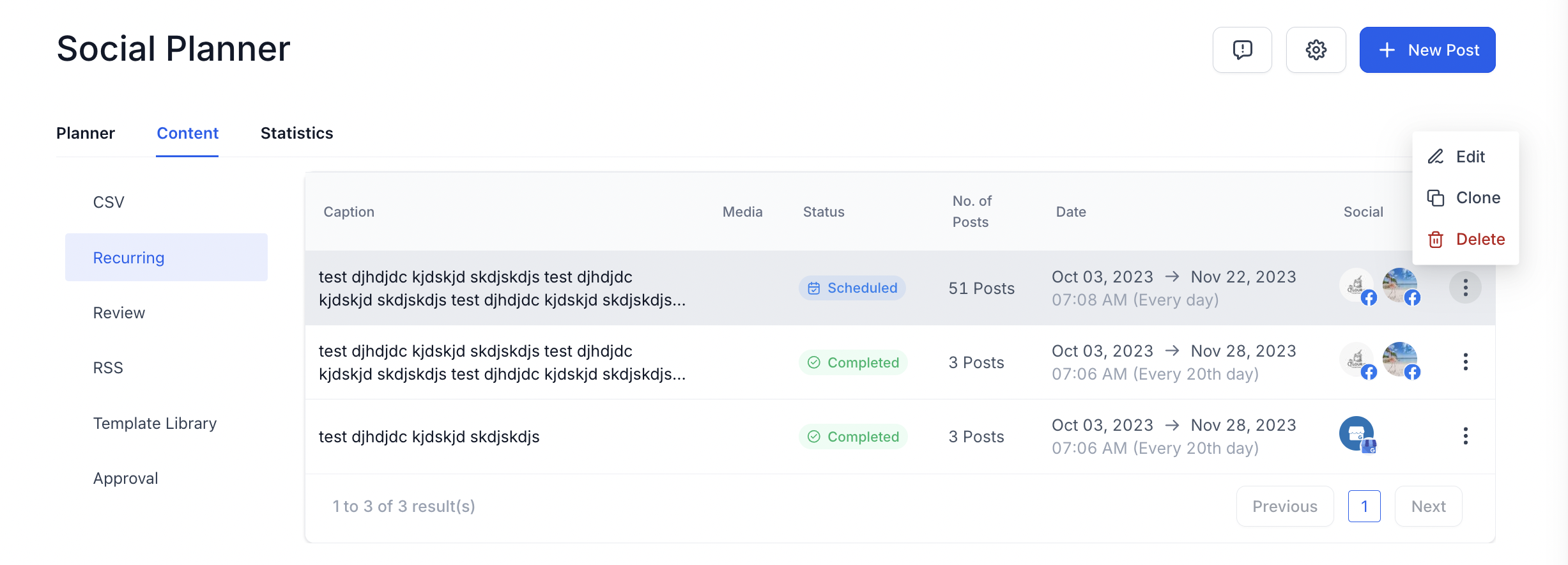 - Recurring Posts Tab: The parent post is added to the Recurring Posts tab once scheduled. Users can access the edit function to change all recurring posts' time and date ranges.