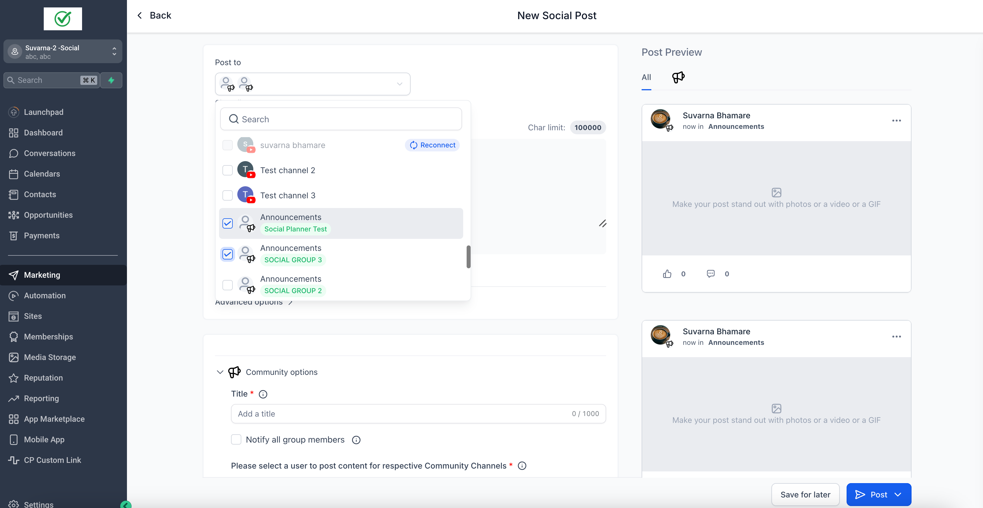 4. Go to Post Composer page, multi-select select the channels and it will mention channel belongs to which groups.