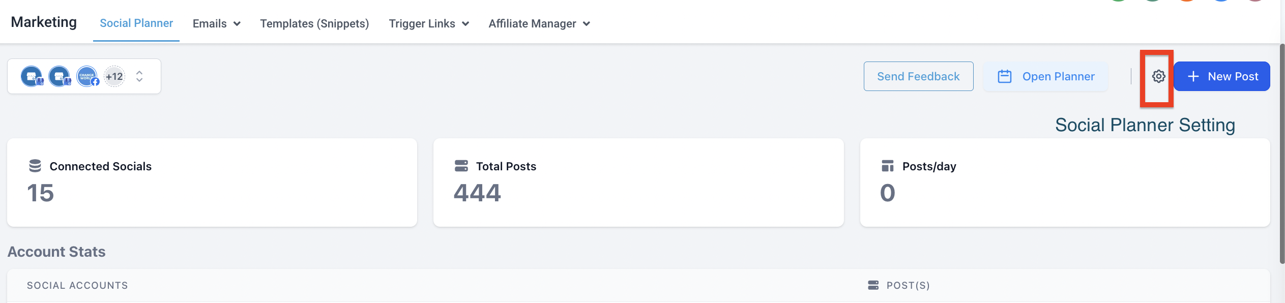 2. In Social Planner, the social planner settings (gear icon) is present beside the New Post button