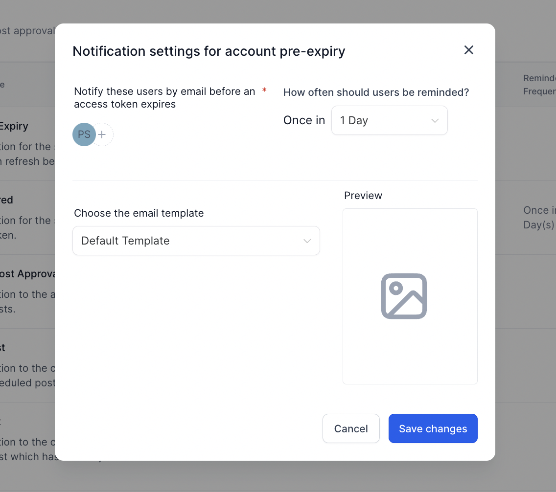 - The notification requires to select the subaccount users, how often should the user be reminded to refresh the account [they can refresh the token by visiting the integration page], user can select the different template other than default templates.