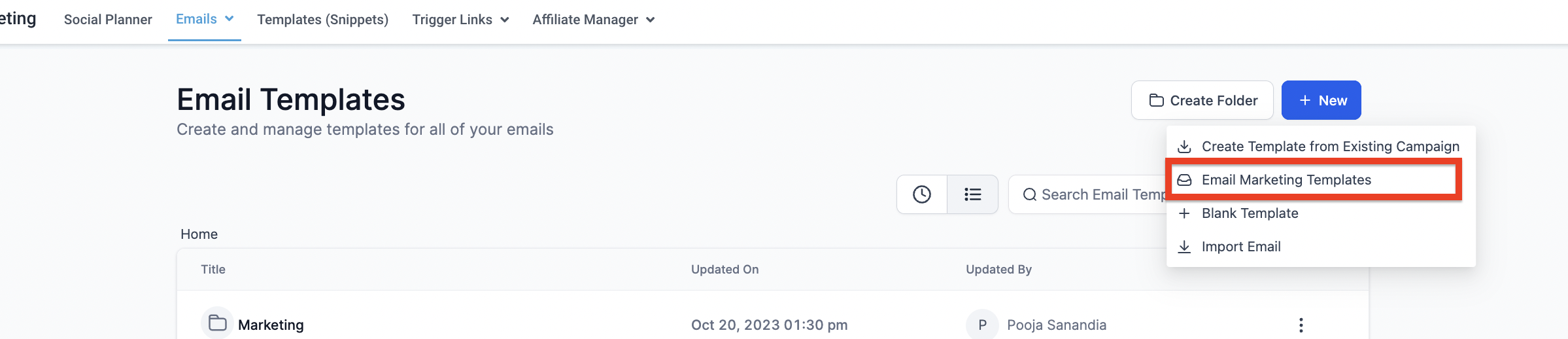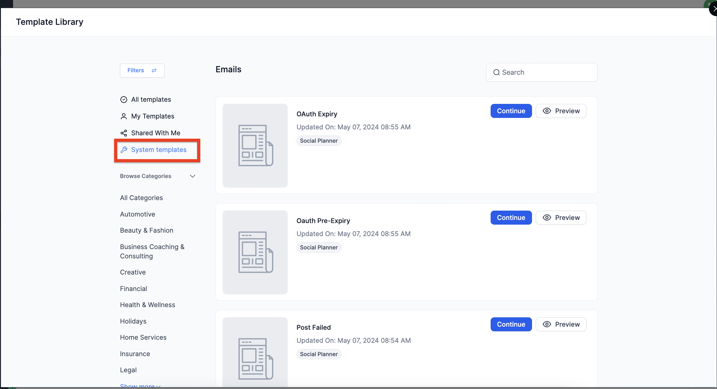 To change the default email template, the user should visit the Emails > Template. Click on the New option and select the Email Marketing Template. When the template library open, on left side there is option of System Template which you can select the template and load it for editing the content. Go to the social planner notification option and change the template.