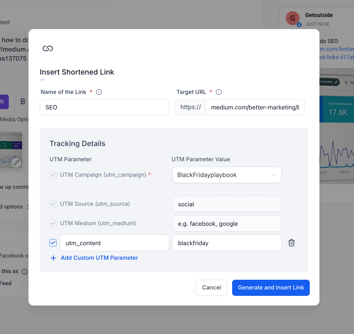 - User will have to click on the shortened url icon to start with adding name of the link, add the target URL and add all the custom parameters.