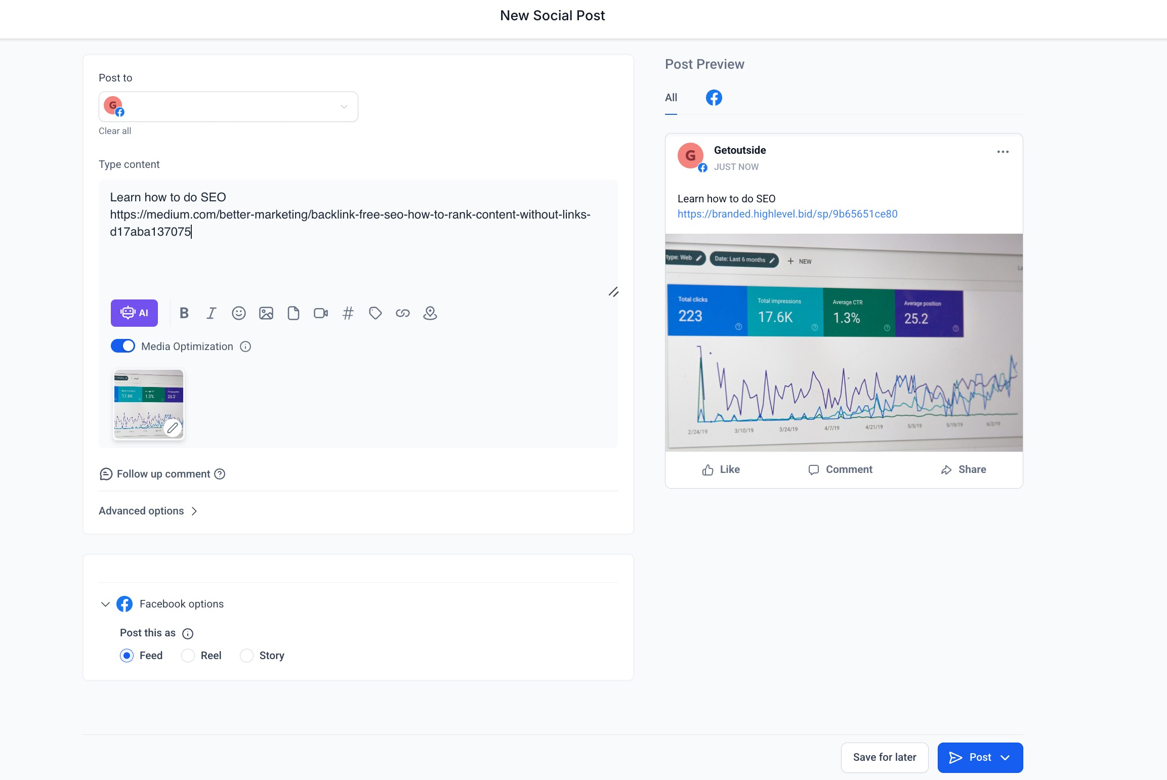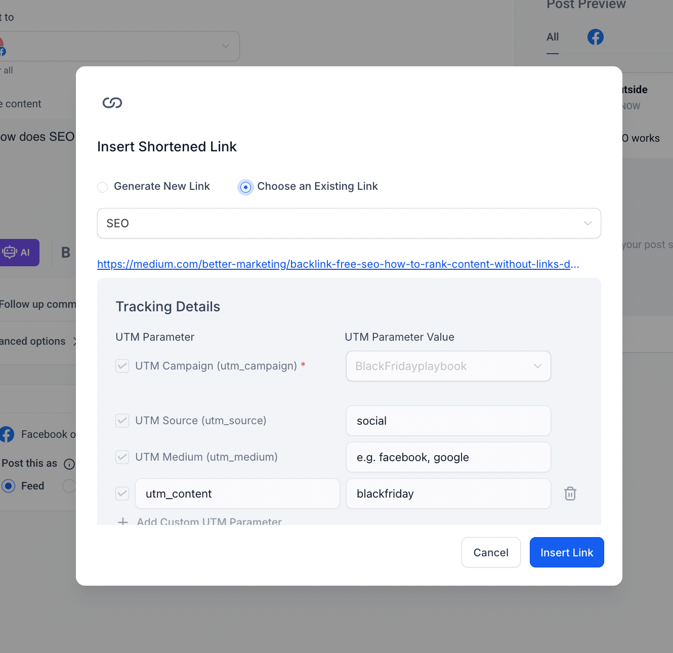 4. User can add the content for the social post where if you add long url. If you click on the URL shortener, the url will get shortened in the preview. In the input box of content, it will stay as long url.