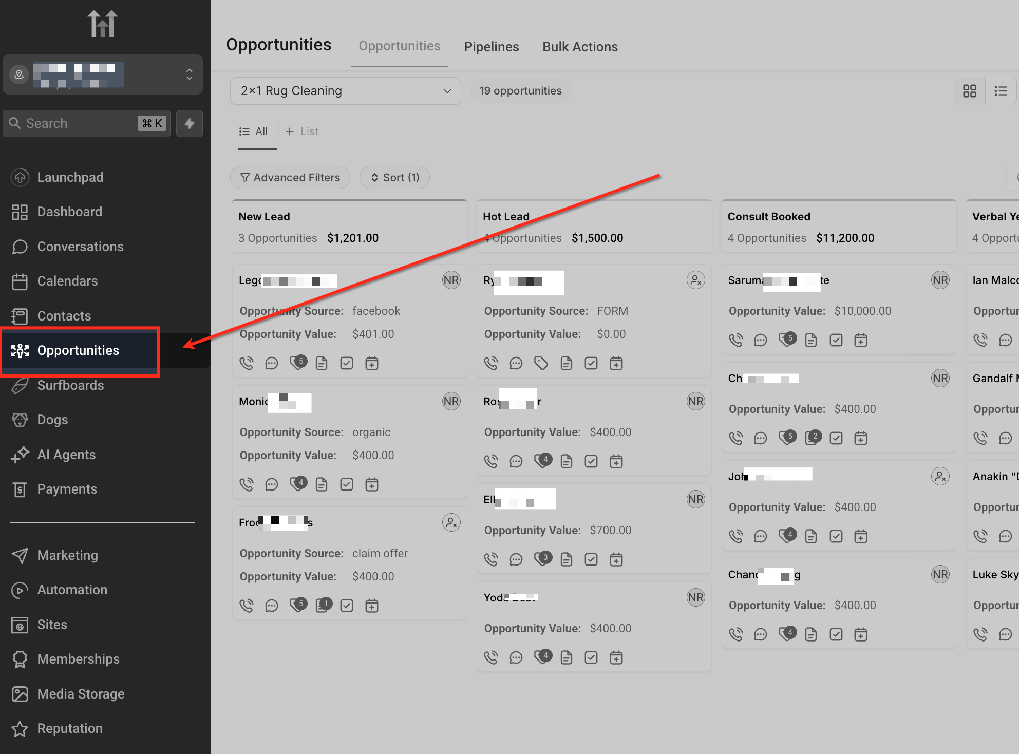 To begin using bulk actions, navigate to the Opportunities tab from the left-hand menu. This opens the card view where all opportunity stages and entries across your pipeline are displayed.